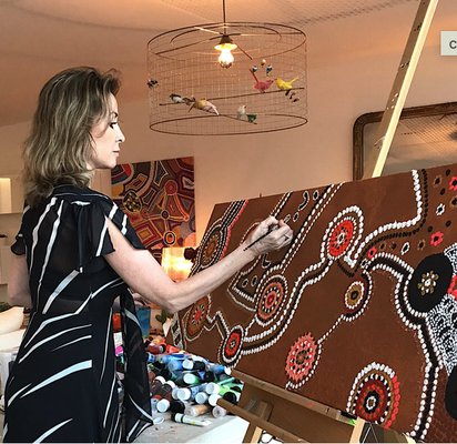 Traces d'opossum, tortue, deux personnages sous un abri ou dans une grotte, traces de casoar et œufs, crocodile, camps et chemins les reliant, étoile, trace de grenouille (ou crapaud citerne), pluie, cacatoès, œufs de serpents